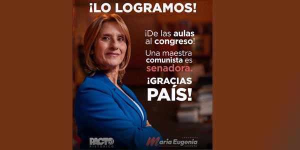 La nueva senadora comunista, electa en la lista del Pacto Histórico, María Eugenia Londoño, con alegría expresó que para los y las comunistas es un momento histórico porque se van a profundizar las reformas estructurales que materializan la paz con justicia social. “Revolución política, ética, económica, social, revolución feminista, revolución por el cuidado del medio ambiente y de nuestra pacha mama, que se aproxima a lo que significa, para un revolucionario y revolucionaria un socialismo, donde logremos un sistema distinto, un modelo distinto y donde el pueblo tenga lo que le corresponde”.