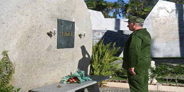 Díaz-Canel rindió tributo a Fidel en el Cementerio Patrimonial Santa Ifigenia, donde reposan restos de héroes, mártires y personalidades de la historia de la isla, asegura una reseña de la Presidencia de la República.