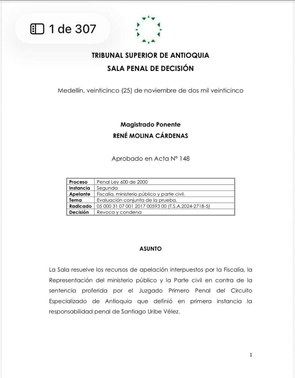 Fragmento del fallo sustentan la decisión del Tribunal Superior de Antioquia de condenar a Santiago Uribe Vélez, hermano del expresidente Álvaro Uribe Vélez, a 28 años de cárcel por homicidio agravado y concierto para delinquir.