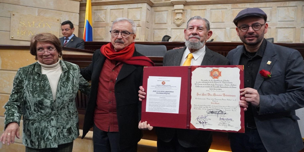 De izquierda a derecha: la senadora Aída Avella Esquivel, presidenta del partido Unión Patriótica (UP), el presidente del Partido Comunista Colombiano, Jaime Caycedo Turriago, el Poeta Nacional José Luis Díaz-Granados y el representante a la Cámara Gabriel Becerra Yáñez, secretario general de la UP, en el acto de condecoración con la Orden de la Democracia “Simón Bolívar” al poeta Díaz-Granados por su trayectoria literaria y al PCC por los 95 años de fundación, en el Salón Boyacá del Congreso Nacional de Colombia (Bogotá, 16 de octubre de 2025).