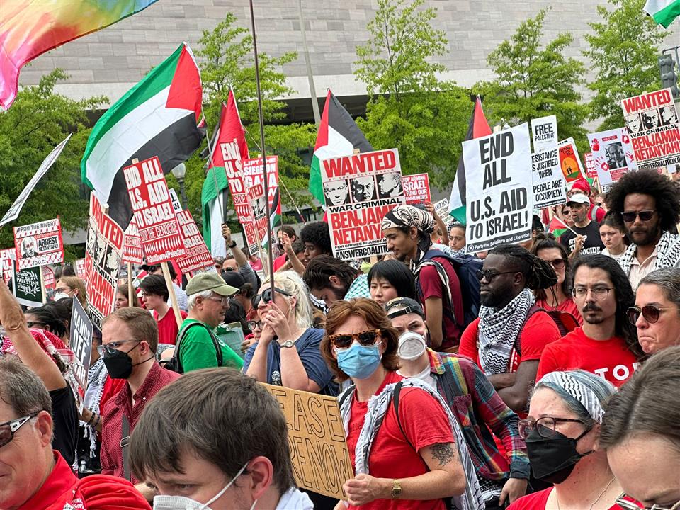 Centenares de personas se congregaron a la altura de la calle 3ra y la Avenida Pensilvania, que estaba bloqueada por la policía, y allí colocaron una tribuna desde donde varios oradores transmitieron el mensaje común de poner fin al genocidio en Gaza y que termine el apoyo de Estados Unidos a su aliado Israel.