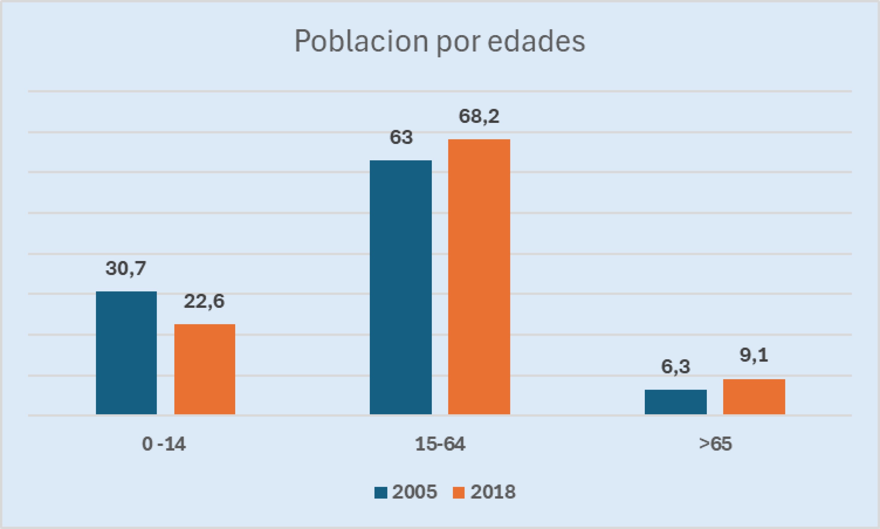 El reto para gobiernos y para la sociedad en general es, cómo sortear el aumento de la población mayor, con la respectiva disminución de la población joven. Es decir, en las próximas décadas – de mantenerse la actual tendencia – no habrá suficientes jóvenes ni para reemplazar la mano de obra de los jubilados, ni para proveer las mesadas de las siguientes generaciones. El gráfico 2 muestra como el porcentaje de menores de 14 años disminuyó entre los censos de 2005 y 2018, al tiempo que la población mayor de 65 años aumentó de 6,3 a 9,1 por ciento.